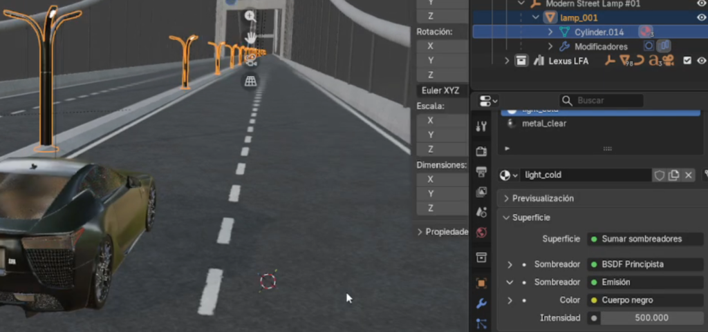 Evidenciamos que se ve muy oscuro, entonces seleccionamos los faros y ponemos 500 en intensidad