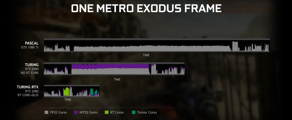 Nota. Uso de unidades de cómputo en un fotograma de Metro Exodus con ray tracing. En una GPU Pascal (GTX 1080 Ti) se saturan los shaders FP32 (gris). En Turing sin RT Cores (RTX 2080 sin RT) aparecen también núcleos INT32 (púrpura). Con RT Cores y DLSS activos (RTX 2080) gran parte de la carga pasa a los RT Cores (morado) y Tensor Cores (verde), reduciendo drásticamente el tiempo de cuadro. Adaptado de NVIDIA, s.f., Ray Tracing Technologies. https://www.nvidia.com/es-la/geforce/news/geforce-gtx-dxr-ray-tracing-available-now/